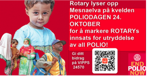 Svend Strand orienterte om Poliodagen 24. oktober og planlagt innsats fra Mesna Rotary i samarbeid med Lillehammer Rotary. Opplegget innebærer lyssetting av Mesnaelva om kvelden 24. oktober og en stand på Frisenberghjørnet 25. oktober.
